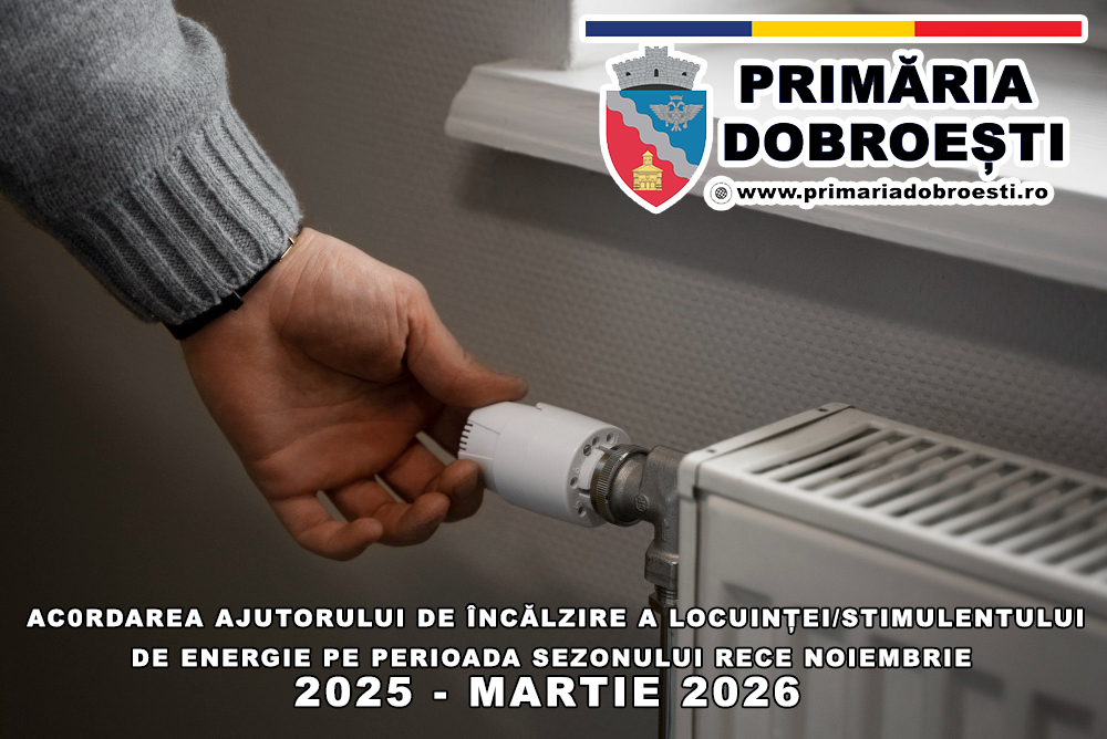 Primăria Comunei Dobroești informează că, persoanele interesate pot prelua cererile-tip şi declaraţiile pe propria răspundere pentru acordarea ajutorului la încălzirea locuinţei/stimulentului de energie pe perioada sezonului rece noiembrie 2025 – martie 2026, de la sediul Primăriei Dobroești, Compartiment Asistență Socială și Autoritate Tutelară (str. Cuza Vodă, Nr. 23).