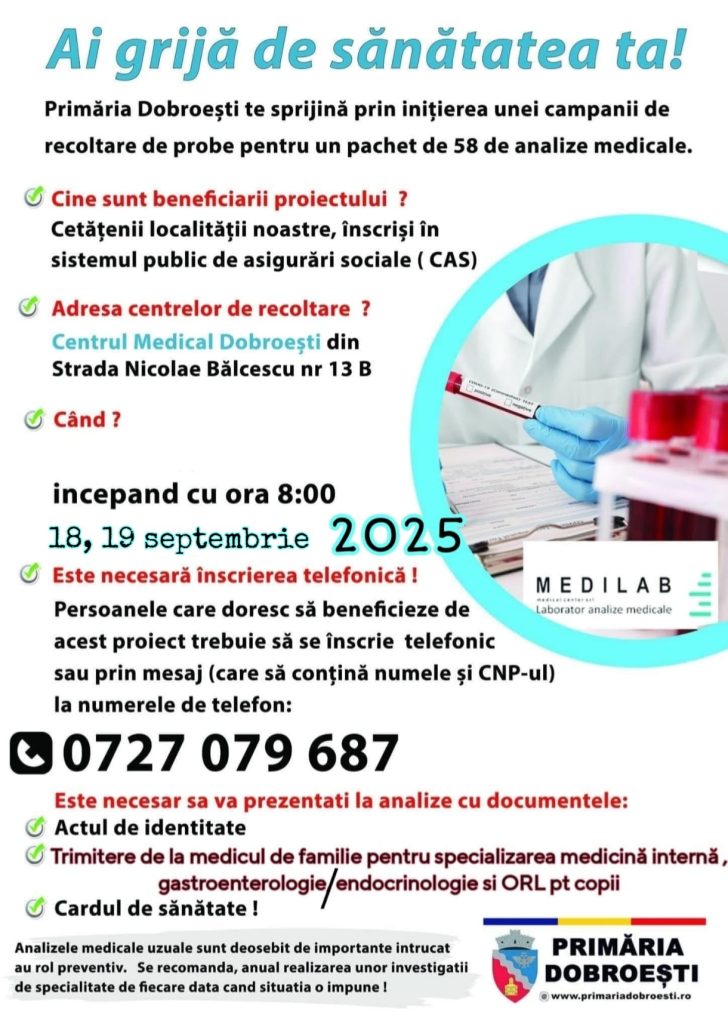 Primăria Dobroești vine in sprijinul Dvs prin intermediul unei noi campanii de recoltare de probe pentru un pachet de 58 de analize medicale.