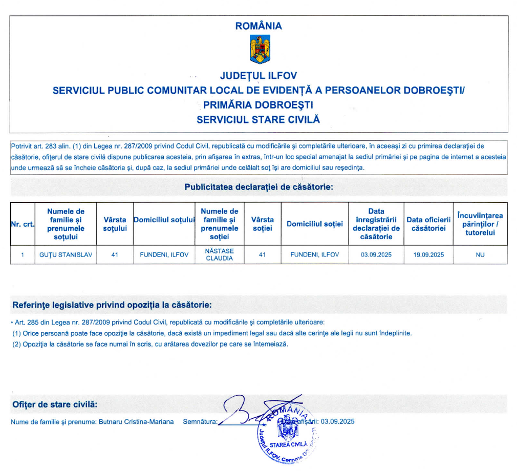 Publicatie casatorie GUTU STANISLAV SI NASTASE CLAUDIA 2025